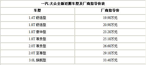 此次一汽-大众共公布了7款车型的售价,其中1.8TSI和2.0TSI车型先期投放市场,随后还将推出1.4TSI和3.0L V6车型。据悉,全新迈腾售价区间为19.98-33.48万元,外观可选糖果白、开罗金、反射银、夜光蓝、深黑、玄武灰、摩卡棕,内饰可选灰色、米色、黑色、咖啡色、黑米双色。详细价格请见下表