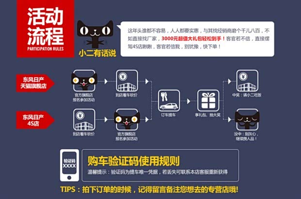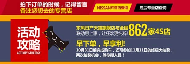 活动期间内登录淘宝账号(用手机扫二维码进店,或是用电脑搜索进入东风日产官方旗舰店)→点击全部宝贝→选择意向东风日产车型→拍下支付定金→收到短信验证码→定车完成。