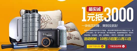 活动期间,凡在天猫官方旗舰店1元下订并交车的客户,即享在线下专营店成交价基础上的东风日产厂家额外赠送的价值3000元原厂精品礼包套件