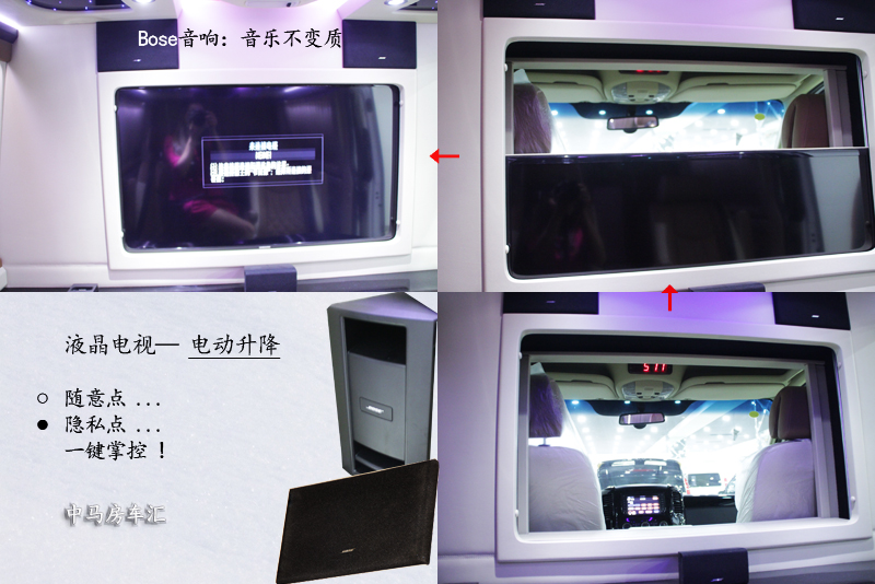 乘客区和驾驶舱采用隔断式隐私构造,42寸液晶电视(带卫星电视)、DVD播放器、Bose高级环绕立体声音响及低音炮、豪华版吧台和酒柜、咖啡机、和苹果座充,无论是听一首不会变质的音乐、看一场迷你包厢中播放的电影、还是现磨一杯纯浓咖啡、品一杯香溢红酒,这片区域能够带给乘坐者最佳的娱乐及放松享受!