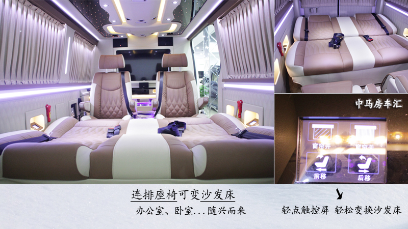 轻点右手边触控屏的“前移”选项,连体沙发便慢慢躺倒成床,无论是严谨的移动办公室或是休闲的带床卧室,都可随兴而变!