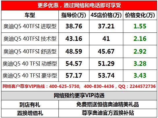 长沙奥迪Q5最高综合优惠34300元。6.13长沙恒信奥迪“年中大促,惠购者联盟”钜惠活动启动更有大礼等着您,届时恭迎您到店。店内更准备了12期“0”月供,18期超长贴息,低首付等金融政策,长沙恒信奥迪“品荐二手车置换”还可额外获享置换大礼包!更多优惠尽在长沙奥迪恒信奥迪4S店。活动当天订车即可享受鹅洲岛骑马之旅,咨询热线:400-625-5750、400-830-4436
